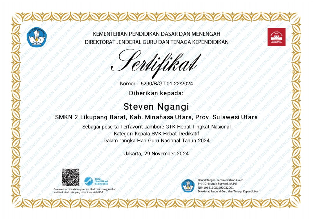 Dimana sebelumnya telah berhasil meraih predikat Praktik Baik Terfavorit Kategori GTK Dedikatif Kepala SMK se-Sulawesi Utara pada Jambore GTK Hebat dalam rangkaian perayaan Hari Guru Nasional Tahun 2024 yang diselenggarakan oleh Balai Guru Penggerak Provinsi Sulawesi Utara.
