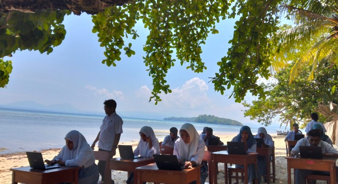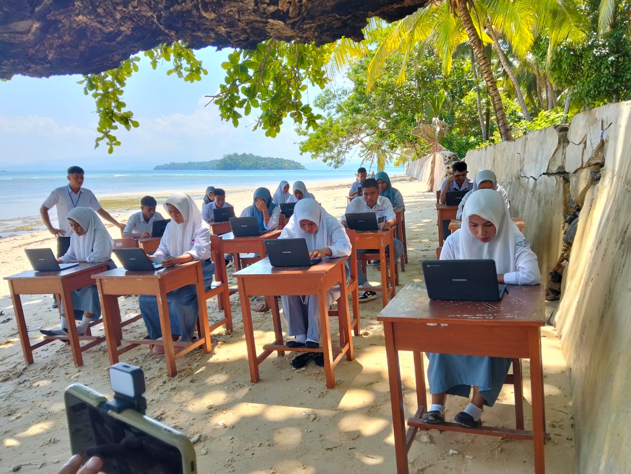Untuk memastikan para siswa tetap bisa melaksanakan TKA sesuai jadwal tanpa hambatan teknis, pihak sekolah mengambil langkah tak lazim dengan memindahkan “ruang ujian” ke tepi pantai yang dikenal memiliki titik sinyal lebih kuat. Meja dan kursi disiapkan layaknya ruang kelas darurat hanya beberapa meter dari air pasang.