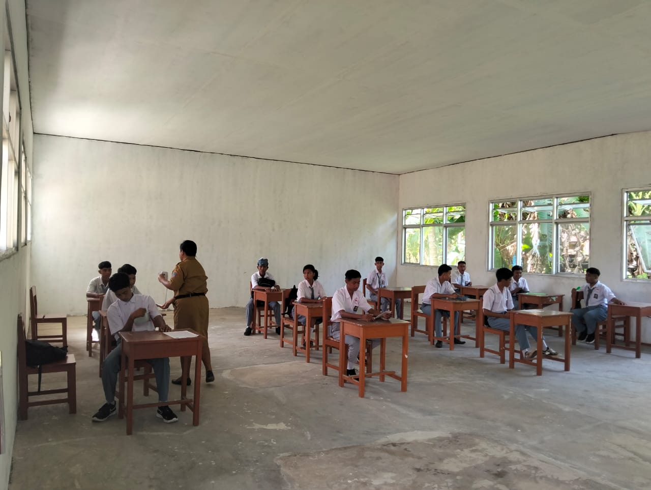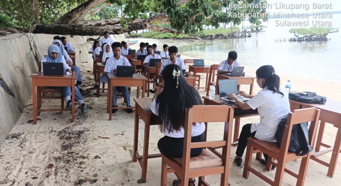 Sejumlah meja dan kursi ditata menyerupai ruang kelas, hanya beberapa meter dari garis batas tertinggi air pasang. Belasan siswa SMKN 2 Likupang Barat tampak serius menyelesaikan pertanyaan-pertanyaan dalam ANBK tersebut, diawasi sejumlah guru. Di tengah suara deburan ombak, dan tiupan angin, para siswa tetap berkonsentrasi.