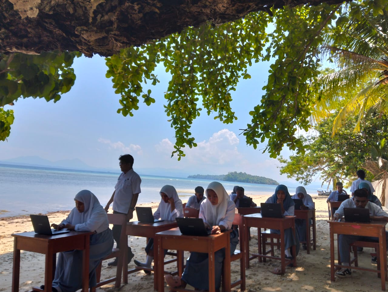 “Alasan pelaksanaan ANBK di sini, karena signal internet bagus di pinggir pantai, kalau di ruangan sekolah signal ada tapi kesulitan untuk ujian online,” ungkap para guru.